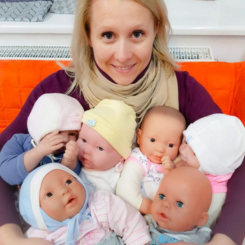 – Oczywiście, że nie wszyscy muszą się tego uczyć. Najlepiej po prostu podążać za swoimi potrzebami i dziecka. Jeśli dzidziuś świetnie się bawi leżąc na podłodze albo w domu jest wiele rąk do pomocy, to może się okazać, że chusta w ogóle nie będzie potrzebna w tej rodzinie. Jeśli świadomie planujemy korzystać z tego narzędzia, bo wiemy, że poza korzyściami w postaci wolnych rąk, niesie ze sobą także dużo innych plusów dla całej rodziny, to wtedy polecałabym naukę jak brzuszek ciążowy nie będzie jeszcze za duży. Lalki, na których ćwiczymy są ciężkie i duże jak prawdziwe niemowlę, więc musi być na nie „miejsce” z przodu ciała. Dobrze więc nie czekać z nauką do 8-9 miesiąca ciąży. Z drugiej strony ucząc się tak wcześnie ryzykujemy, że do czasu rozwiązania pozapominamy jak się wiąże. Wiązanie lalki różni się też od wiązania dzidziusia chociażby tym, że lalka się nie rusza. Można więc spokojnie zaczekać z nauką wiązania do czasu, kiedy maluszek już będzie na świecie. Tym bardziej, że doradcy dojeżdżają do domu nawet do kilkudniowych dzieci, przywożą chusty, pożyczają, więc nie trzeba mieć swojej, żeby się przeszkolić.